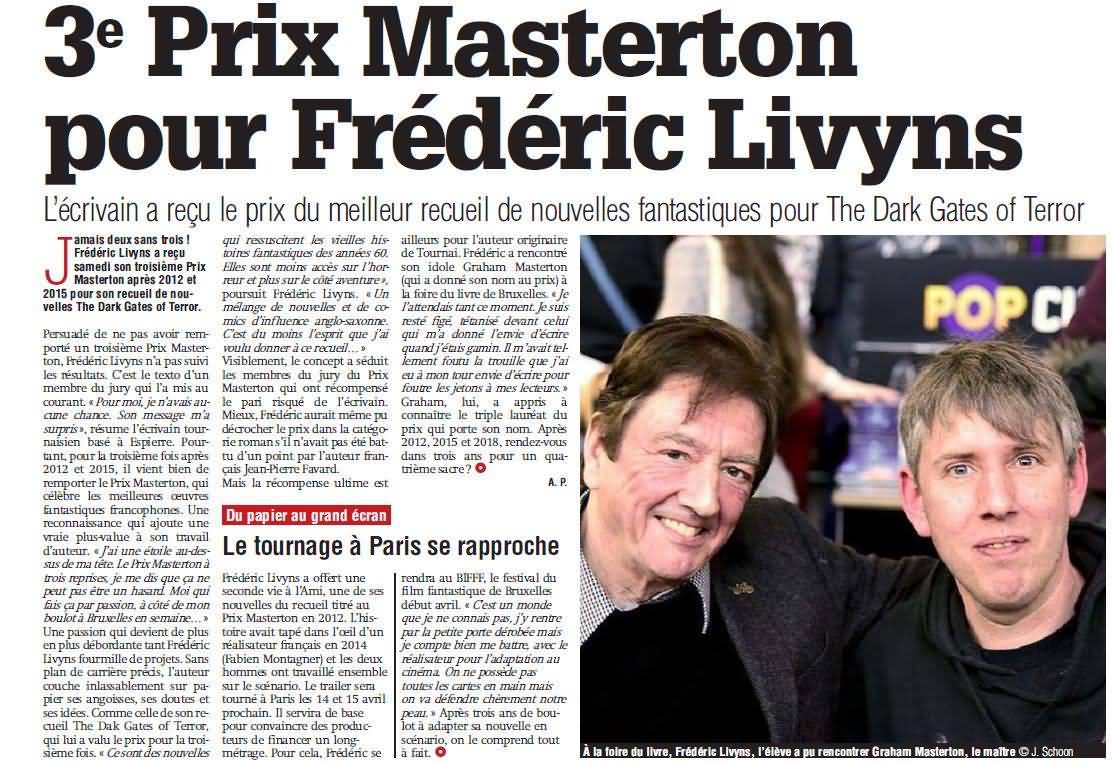 - The Prix Masterton will be awarded in Paris this month. The winners have already been selected by the panel but will obviously only be announced at the "remise de prix." The awards are for the best horror/fantasy novels in the French language and the judges were: Marc Bailly, editor of Naturellement publishers and editor-in-chief of Phenix and Science Fiction magazines; Thomas Bauduret, translator and writer; Daniel Conrad, co-editor of Tenebres magazine; Christophe Corthouts, writer; Benoit Cousin, editor of J'ai Lu bookclub; Benoit Domis, co-editor of Tenebres; Anne Duguel, writer; Alain Pelosato, editor of Naturellement; and Francois Truchaud, translator.